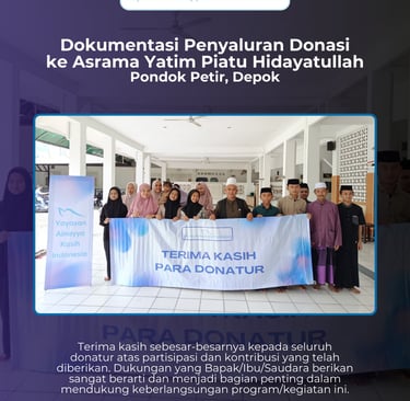 Yayasan Ainayya Kasih Indonesia berkomitmen untuk menyalurkan dana donatur kepada penerima yang tepat sasaran. Melalui transparansi dan kepercayaan, kami memastikan setiap sumbangan digunakan secara efektif untuk membantu mereka yang membutuhkan. Bergabunglah dengan kami dalam misi mulia ini untuk menciptakan perubahan positif di masyarakat.